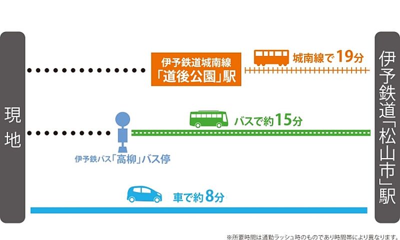 伊予鉄道市駅線「道後公園」駅 徒歩14分~15分 伊予鉄道高浜線「松山市」駅 徒歩40分~40分 |