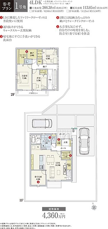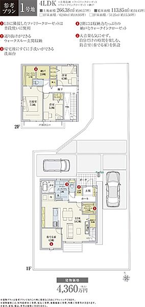 | 建物面積 | - | 土地面積 | 266.38m2(1号地) 私道負担なし |