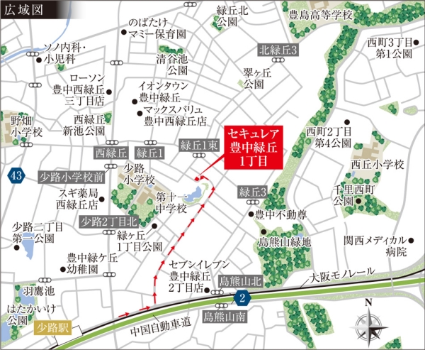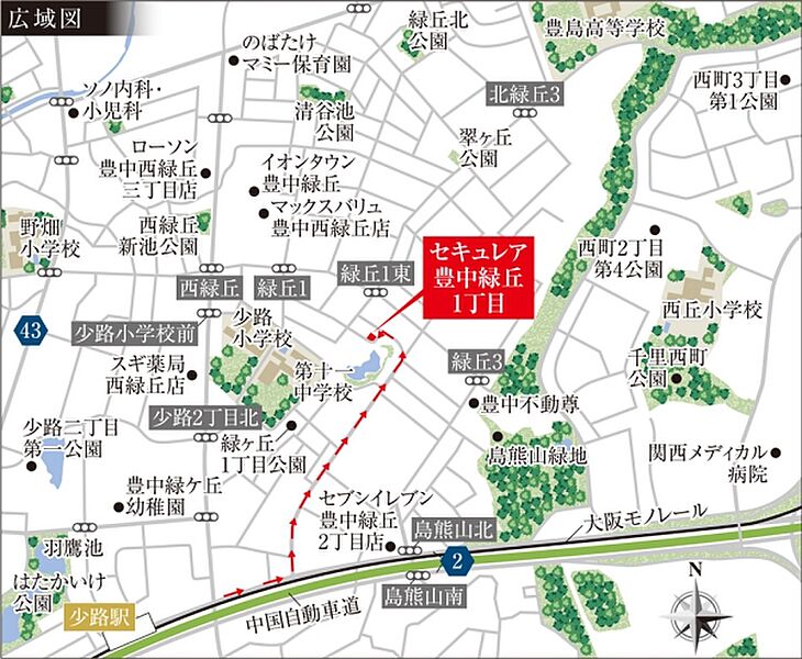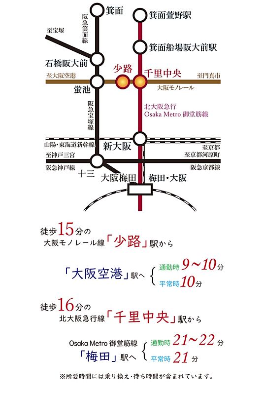 大阪モノレール本線「少路」駅 徒歩15分 北大阪急行電鉄「千里中央」駅 徒歩16分 |