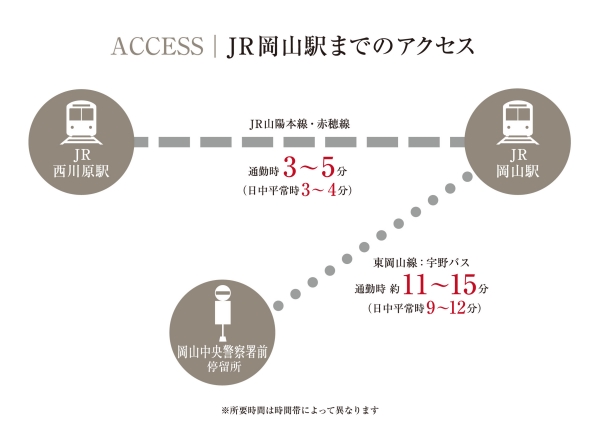 宇野バス「岡山中央警察署前」停留所まで徒歩圏内で、通勤・通学などにも便利です。