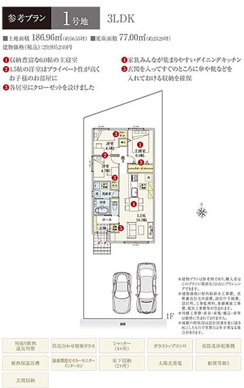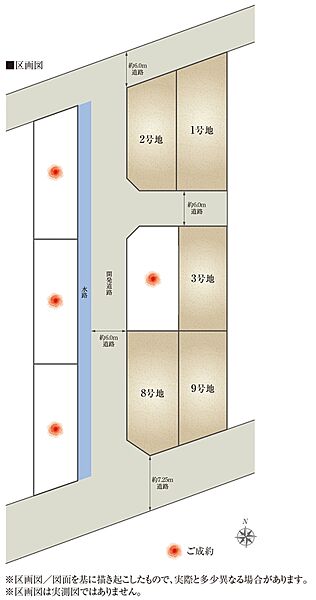 | 建物面積 | - | 土地面積 | 186.96m2(1号地)、157.59m2(2号地)、153.38m2(3号地)、177.16m2(8号地)、154.28m2(9号地) 私道負担なし |