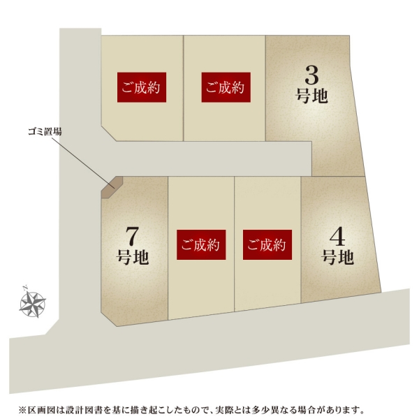 | 建物面積 | - | 土地面積 | 226.34m2(3号地)、178.54m2(4号地)、190.73m2(7号地) 私道負担なし |