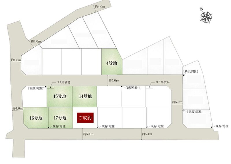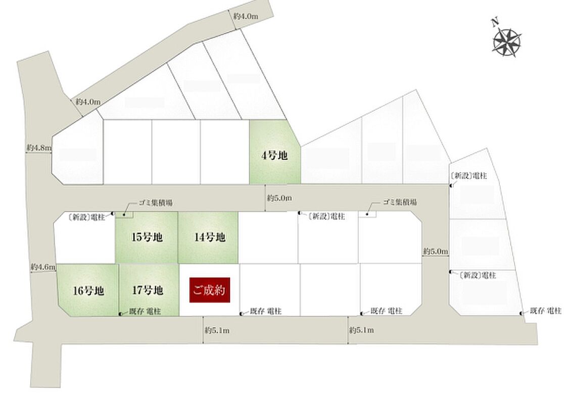 | 建物面積 | - | 土地面積 | 108.55m2(4号地)、108.56m2(14号地)、108.60m2(15号地)、108.60m2(16号地)、108.60m2(17号地) 全て私道負担なし |