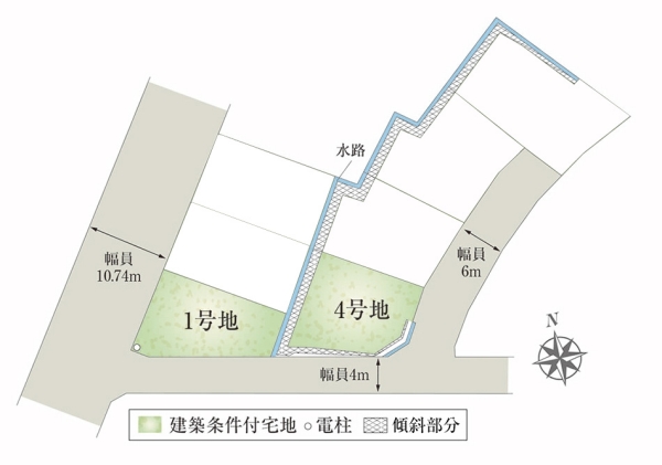 | 開発面積 | 1421.55m2 | 建ぺい率・容積率 | 80%・200%(1号地)、81.97%・200%(4号地) |