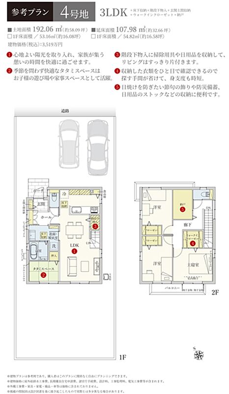 | 建物面積 | - | 土地面積 | 192.06m2(4号地) 私道負担なし |