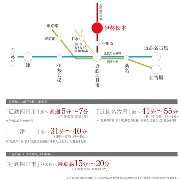 近鉄湯の山線「伊勢松本」駅 徒歩26分~28分 近鉄名古屋線「近鉄四日市」駅 徒歩39分 |