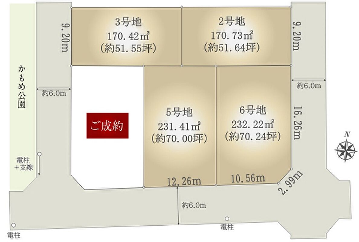| 建物面積 | - | 土地面積 | 170.73m2(2号地)、170.42m2(3号地)、231.41m2(5号地)、232.22m2(6号地) 私道負担なし |