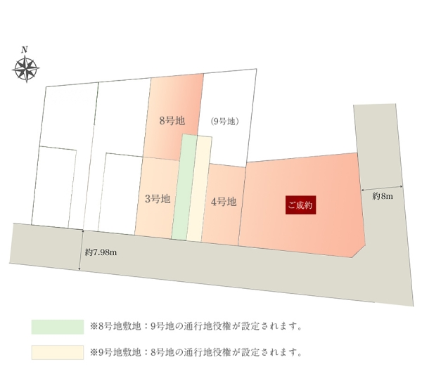 | 建物面積 | - | 土地面積 | 213.90m2(8号地)、112.40m2(3号地)、112.41m2(4号地) 私道負担なし |