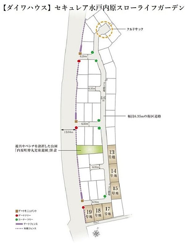 | 備考 | 埋蔵文化財(内原南遺跡)の区域に該当※ゴミ置場6m2のうち13・14・15・17・18・19号地は各19分の1の負担持ち分があります。 [建築条件付宅地分譲とは]この土地は、土地売買契約締結後3ヶ月以内に、大和ハウス工業株式会社と住宅の建築請負契約を締結していただくことを条件として販売いたします。この期間内に住宅を建築しないことが確定したとき、または住宅の建築請負契約が成立しなかった場合は、土地売買契約は白紙となり、受領した金銭は全額無利息で返却致します。詳細については、係員におたずねください。 | ||