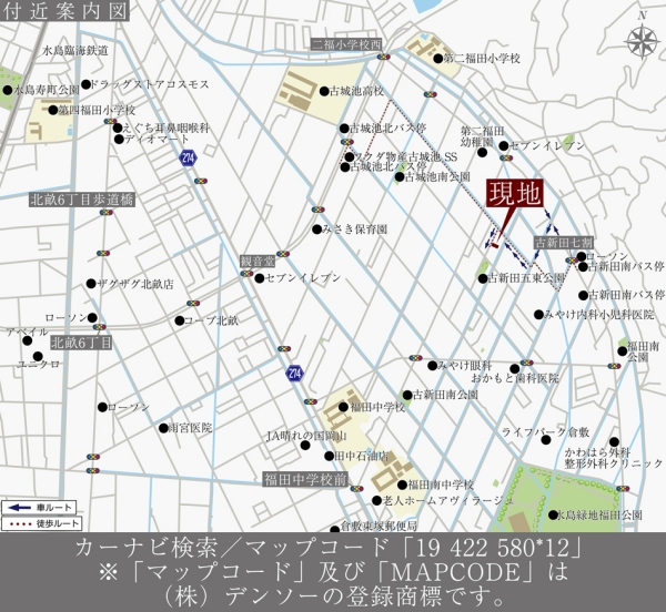 - ※物件から周辺のお店・施設までの距離は、利用が想定される道路を通行した場合の距離です。なお、必ずしも最短距離を保証するものではありません。