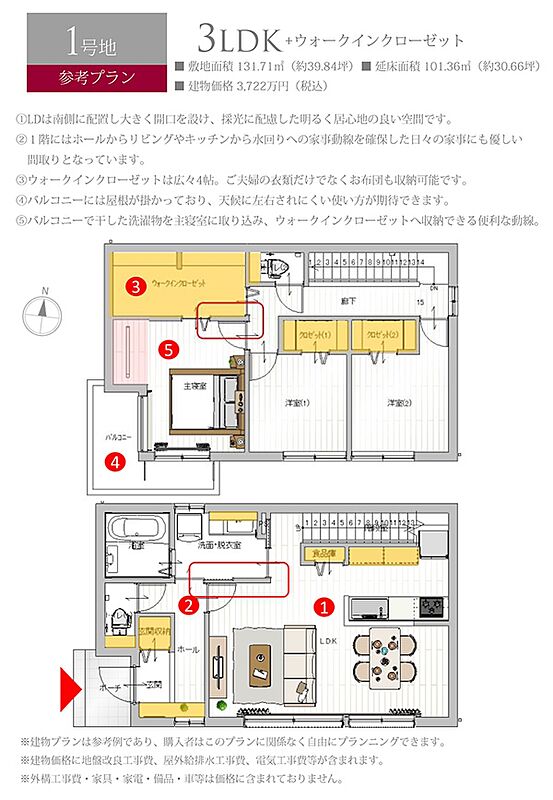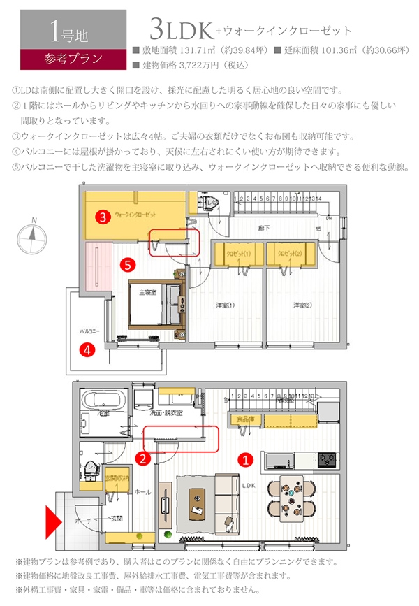 | 建物面積 | - | 土地面積 | 131.71m2(1号地) 私道負担なし |