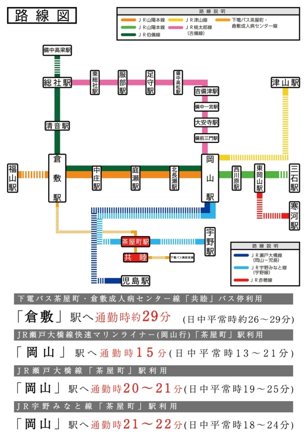 JR宇野線「茶屋町」駅 徒歩11分~12分 JR瀬戸大橋線「茶屋町」駅 徒歩11分~12分 |
