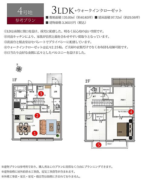 | 建物面積 | - | 土地面積 | 132.00m2(2号地)、132.00m2(3号地)、135.00m2(4号地) 私道負担なし |