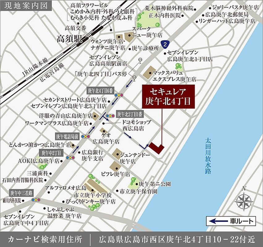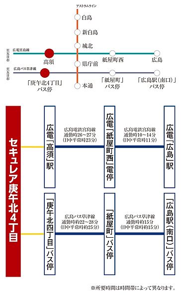 広島電鉄宮島線「高須」駅まで徒歩10分圏内、「庚午北四丁目」バス停まで徒歩5分圏内の立地です。