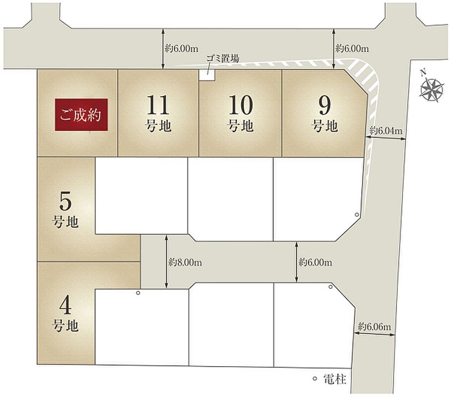 | 建物面積 | - | 土地面積 | 153.08m2(4号地)、155.41m2(5号地)、150.49m2(9号地)、150.50m2(10号地)、150.50m2(11号地) 私道負担なし |