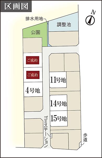| 建物面積 | - | 土地面積 | 202.27m2(4号地)、213.96m2(11号地)、210.51m2(14号地)、208.76m2(15号地) 私道負担なし |