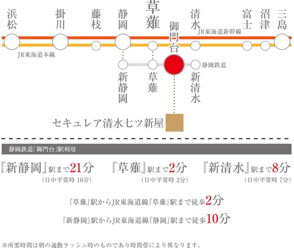 静岡鉄道静岡清水線「御門台」駅 徒歩8分~8分 JR東海道本線「草薙」駅 徒歩20分 |