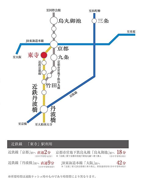 近鉄京都線「東寺」駅 徒歩6分 京都市営烏丸線「九条」駅 徒歩14分 JR東海道・山陽本線「京都」駅 徒歩20分 |