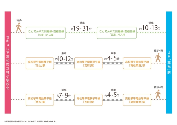 高松琴平電気鉄道琴平線「伏石」駅 徒歩27分~29分 高松琴平電気鉄道長尾線「元山」駅 徒歩31分~33分 JR予讃線「高松」駅 徒歩6分~6分 |