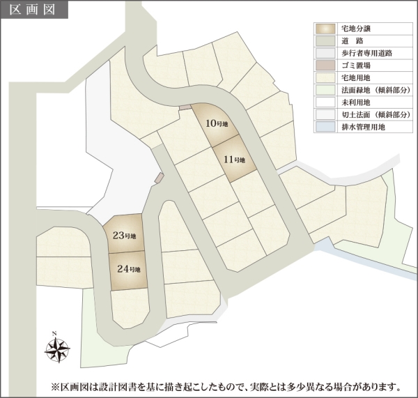 | 建物面積 | - | 土地面積 | 155.10m2(10号地)、157.02m2(11号地)、175.41m2(23号地)、176.39m2(24号地) 私道負担なし |