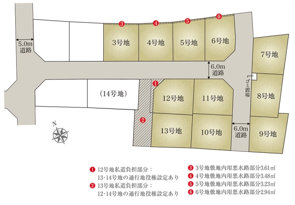 - 147.19m2 私道負担なし(3号地)、146.00m2 私道負担なし(4号地)、146.22m2 私道負担なし(5号地)、143.93m2 私道負担なし(6号地)、139.40m2 私道負担なし(7号地)、140.13m2 私道負担なし(8号地)、146.90m2 私道負担なし(9号地)、155.92m2 私道負担なし(10号地)、151.49m2 私道負担なし(11号地)、150.23m2 私道負担あり 17m2(12号地)、150.19m2 私道負担あり 113m2(13号地)