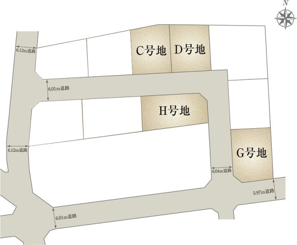 | 建物面積 | - | 土地面積 | 140.07m2(C号地)、140.05m2(D号地)、156.21m2(G号地)、162.00m2(H号地) 私道負担なし |