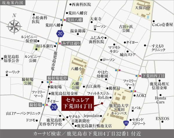 鹿児島市電1系統「騎射場」駅 徒歩6分 JR鹿児島本線「鹿児島中央」駅 徒歩40分 JR鹿児島本線「鹿児島中央」駅 徒歩40分 |