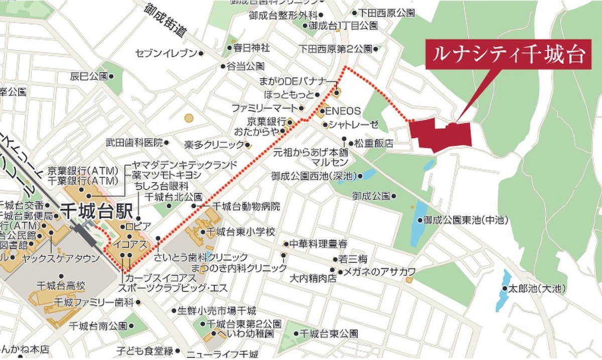 千葉都市モノレール「千城台」駅 徒歩15分~16分 駅まではフラットアプローチで楽々! 京成バス「御成台南」バス停 徒歩4分~5分 最寄りにバス停があるので、アクセスも容易! 京成バス「御成台入口」バス停 徒歩6分~7分 |