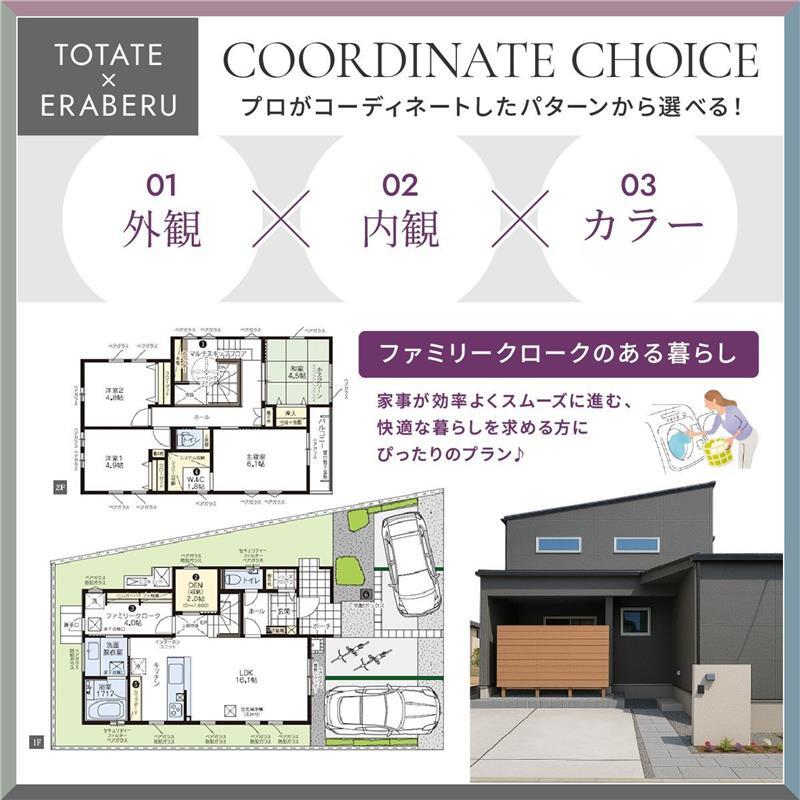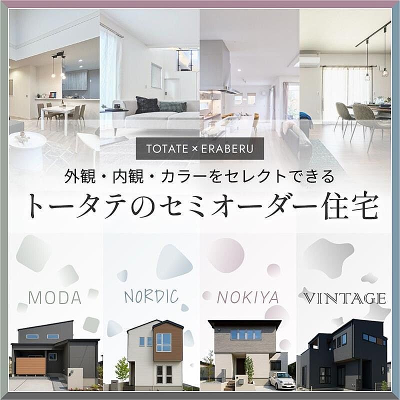 早期にご契約いただくことで厳選されたプランの中から好みに合う《 外観・内観・設備のカラー 》をお選びいただけます。 「トータテ×えらべる」では、住まいの理想を一緒にカタチにしていく楽しさがあります。 ◆ 4つの選べるスタイル 》》》【 MODA 】……アートな暮らしをかなえる 【 NORDIC 】……北欧の自然とともに軽やかに暮らす 【 NOKIYA 】……軒のつくりだす穏やかな光の中に暮らす 【 VINTAGE 】……愛着のあるものに囲まれて暮らす ◆ トータテデザインスタジオで実際に体感できます。詳細はHP、もしくはお問合せください。