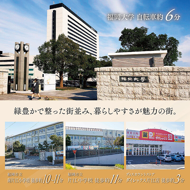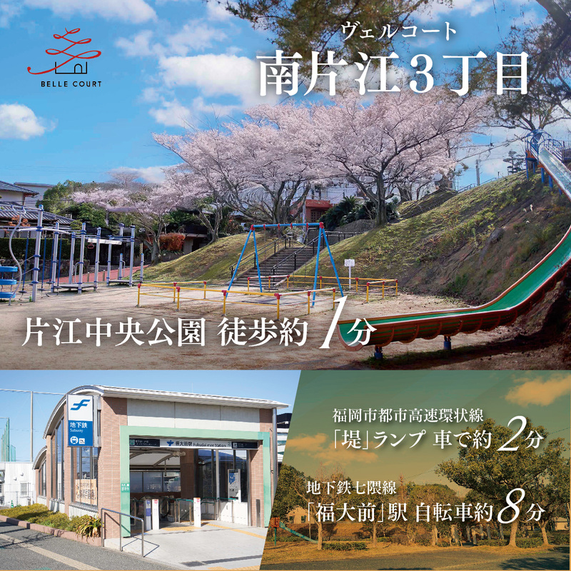 ヴェルコート南片江3丁目から 》》》【教育機関】・「南片江」小学校…徒歩10~11分・「片江」中学校…徒歩11分・油山こひつじ保育園…徒歩11分 【交通機関】・西鉄バス「南町」停…徒歩3~4分・地下鉄七隈線「福大前」駅…自転車8分 【ショッピング】・マルキョウ東油山店…徒歩10~11分・ダイレックス片江店…徒歩3分 【公園】・片江中央公園…徒歩1分