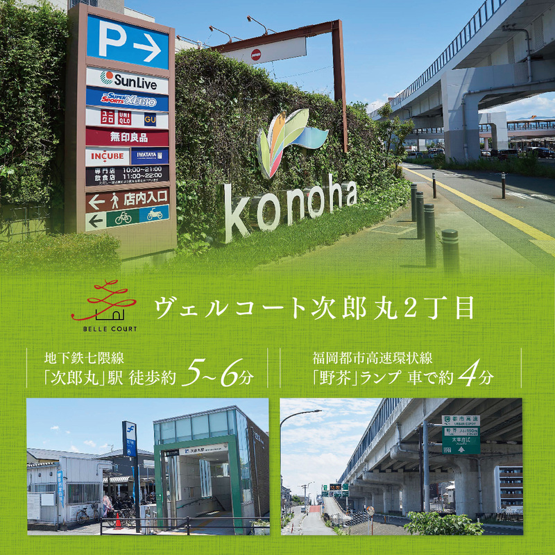 福岡市地下鉄七隈線「次郎丸」駅 徒歩10分 福岡市地下鉄七隈線「橋本」駅 徒歩13分 福岡市地下鉄七隈線「賀茂」駅 徒歩21分 |