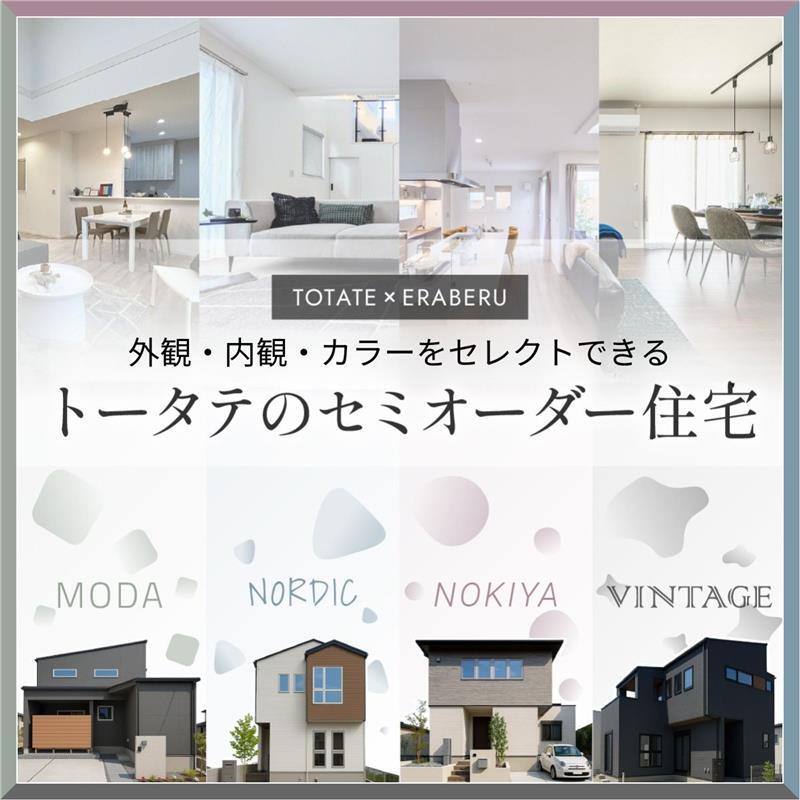早期にご契約いただくことで厳選されたプランの中から好みに合う《 外観・内観・設備のカラー 》をお選びいただけます。 「トータテ×えらべる」では、住まいの理想を一緒にカタチにしていく楽しさがあります。 ◆ 4つの選べるスタイル 》》》【 MODA 】……アートな暮らしをかなえる 【 NORDIC 】……北欧の自然とともに軽やかに暮らす 【 NOKIYA 】……軒のつくりだす穏やかな光の中に暮らす 【 VINTAGE 】……愛着のあるものに囲まれて暮らす ◆ トータテデザインスタジオで実際に体感できます。詳細はHP、もしくはお問合せください。