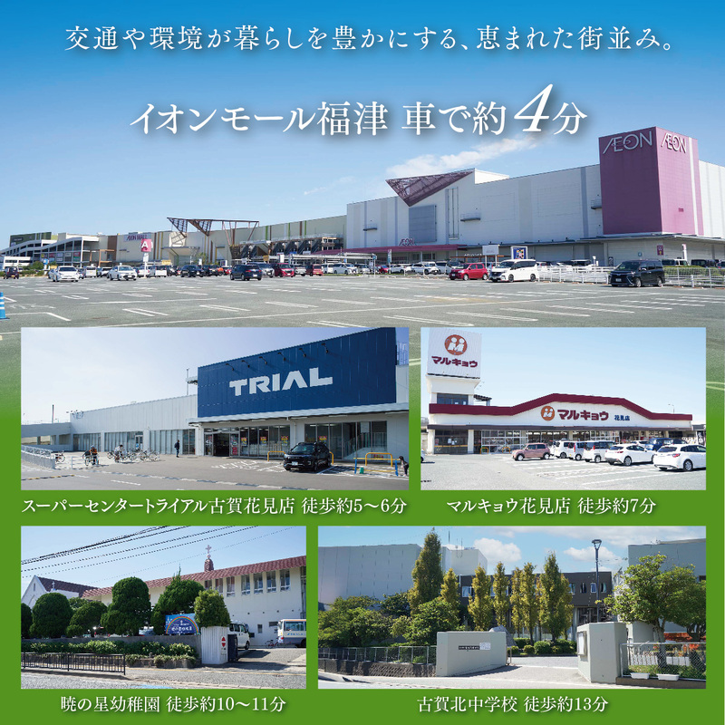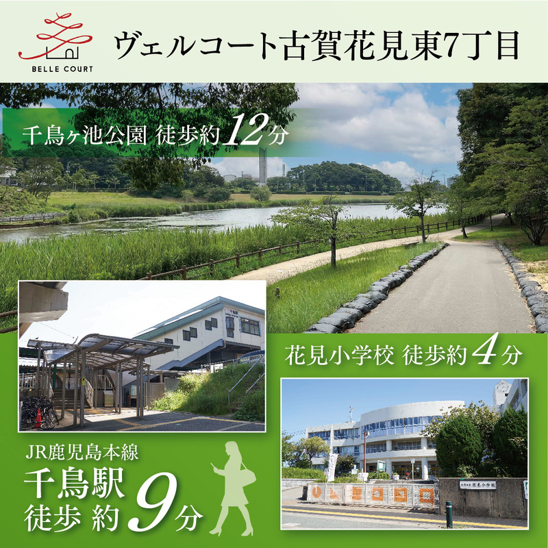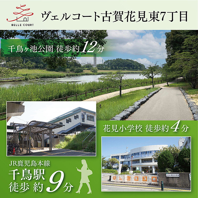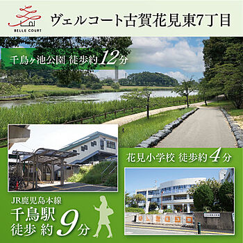 ヴェルコート古賀花見東7丁目から 》》》【教育機関】・「花見」小学校…徒歩4分・「古賀北」中学校…徒歩13分・花見あおぞら保育園…車で2分 【交通機関】・西鉄バス「名糖前」停…徒歩6~7分・JR鹿児島本線「千鳥」駅…徒歩9分 【ショッピング】・スーパーセンタートライアル古賀花見店…徒歩5~6分・マルキョウ花見店…徒歩7分 【公園】・千鳥ヶ池公園…徒歩12分