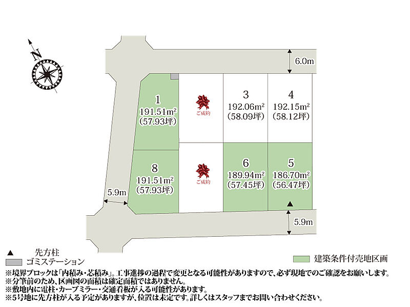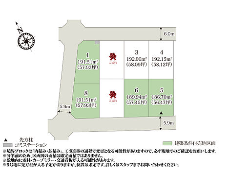分譲地は1・2・3・4号地は自然光が入りやすい南道路、5・6・7・8号地はプライバシーが確保された北道路となっております。