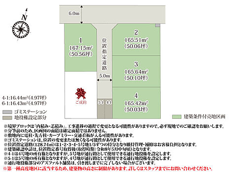 【区画図】全区画50坪以上なので、建物スペース・駐車スペースにゆとりが取れる広さです。分譲地内に敷かれた位置指定道路は車の通り抜けを防ぐことで、安全性が高くなっております。