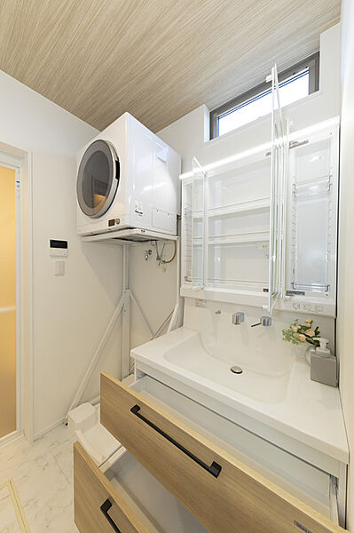 機能性と快適さを兼ね備えた洗面室。身支度をスムーズにできる三面...