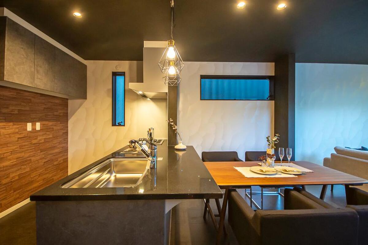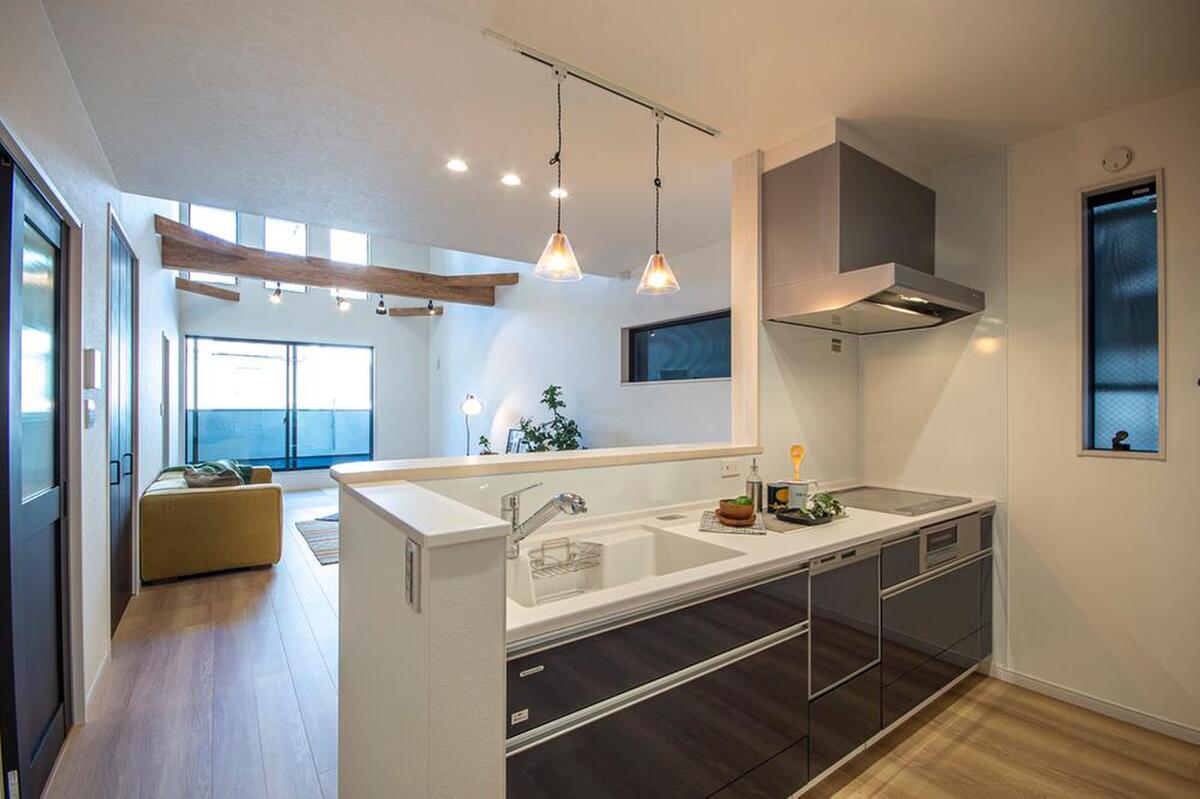 奥行のあるカウンターを採用したフルフラットタイプのキッチン。作業時はもちろん、配膳の際も便利です。《分譲地外:建物面積111.16m2、建物価格1997万円》