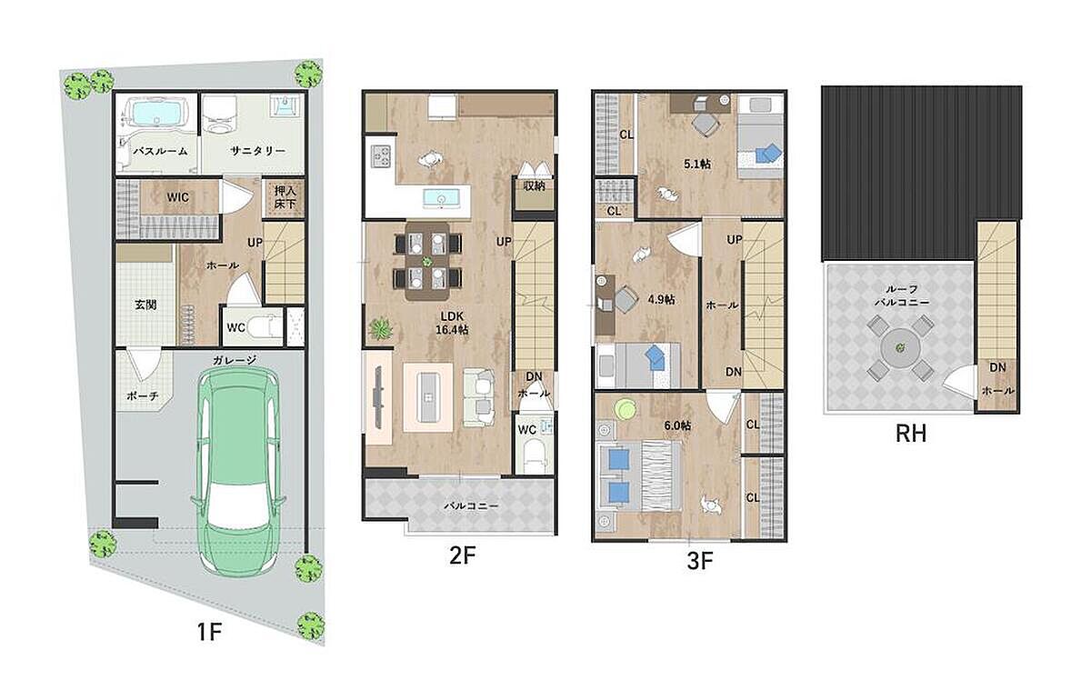 - ※完成予想図やCG合成画像は、門塀・植栽・庭・外観等、実際とは多少異なる場合があります。
