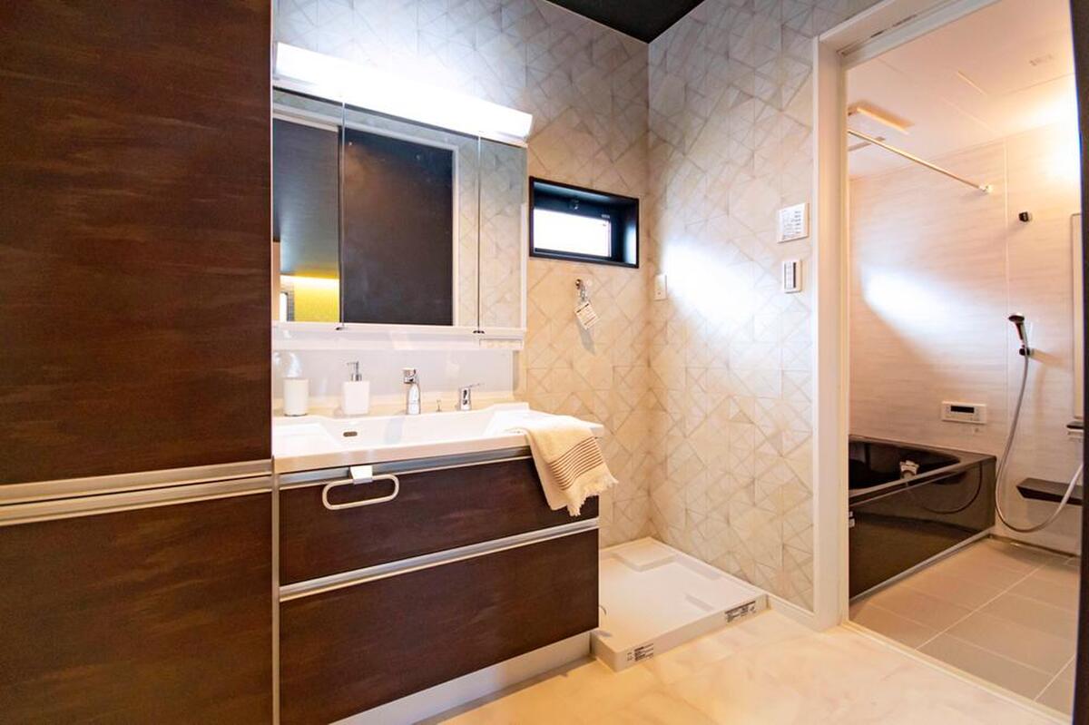 ダークカラーを用いることで落ち着いた印象の洗面室。扉付き収納は...