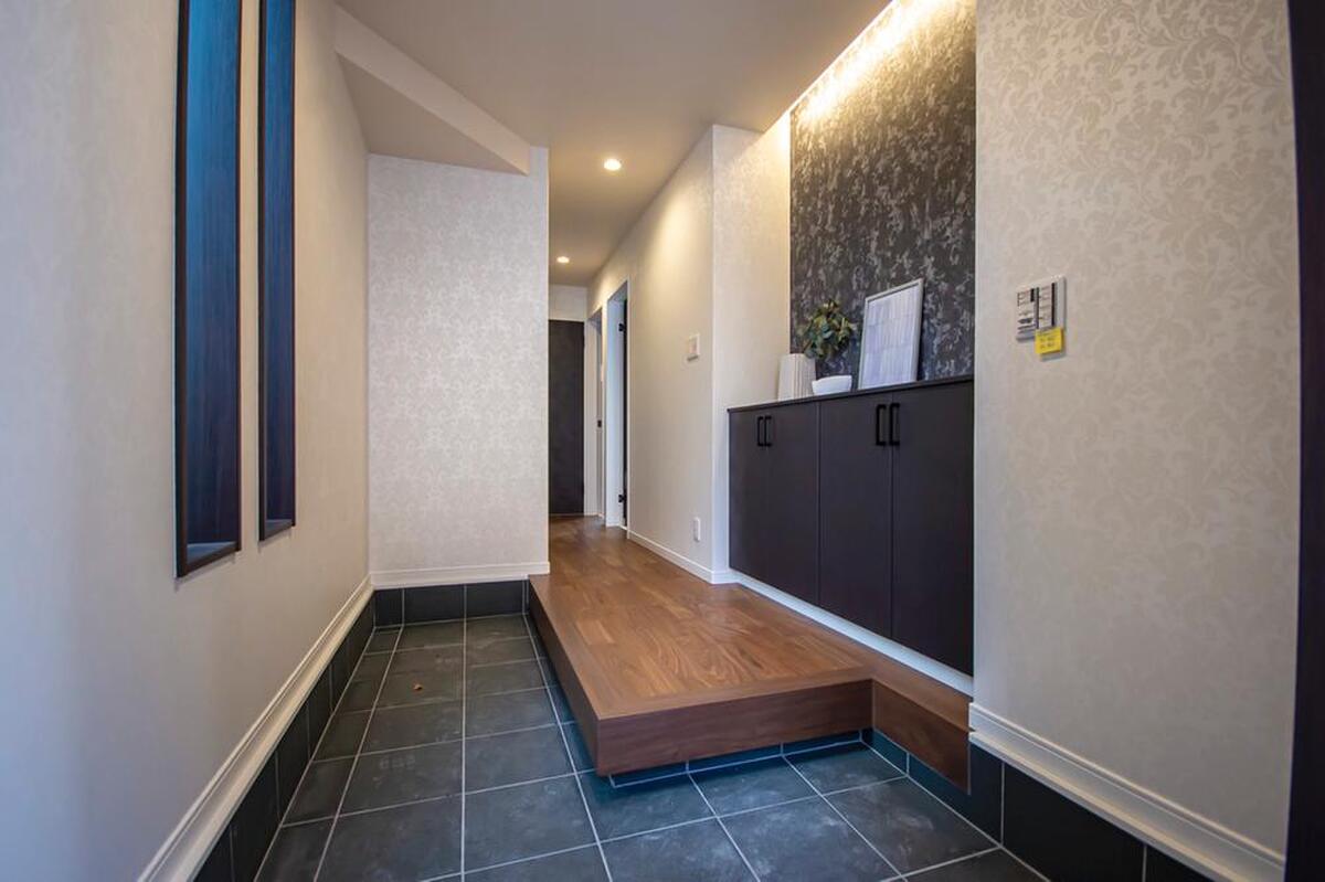 L字型の土間のある玄関スペースは、一度に複数人が靴を脱ぎやすい...