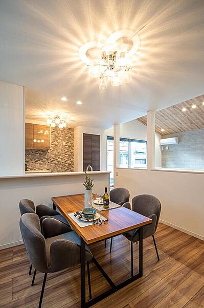 縦方向の空間の広がりを感じられる勾配天井が印象的なダイニング。...