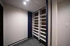 可動棚付きの大容量のシューズクローゼット。ご家族分の靴や雨具の...