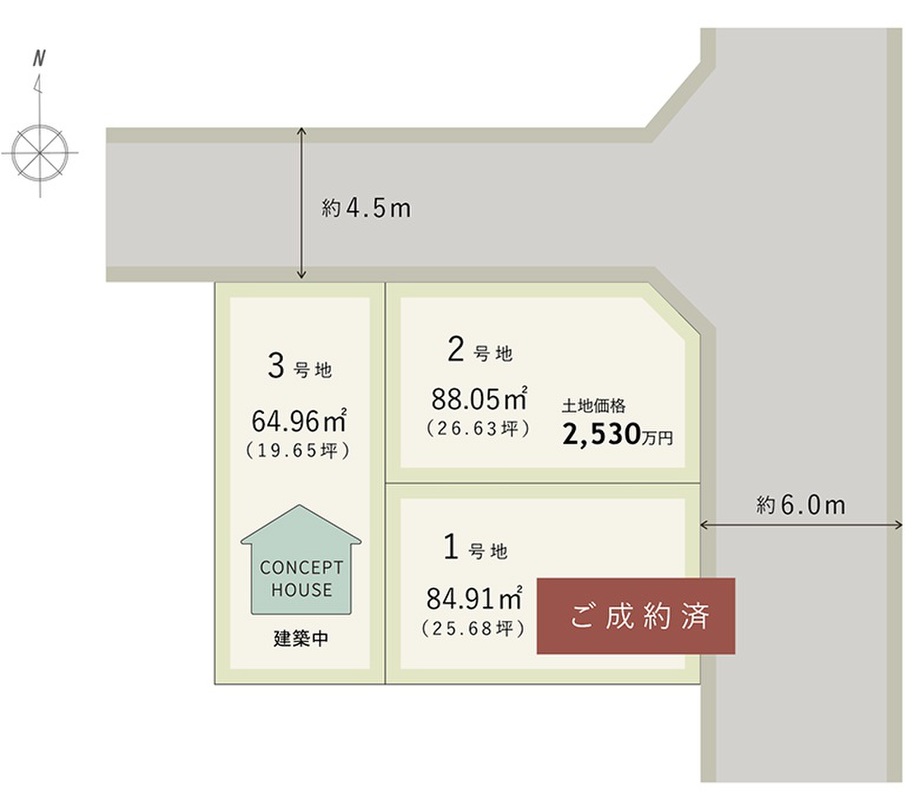 角地を含む全3区画の街並みが誕生。前面道路は幅員約4.5m~6.0mです。整った区画形成のため、敷地面積を有効活用できます。