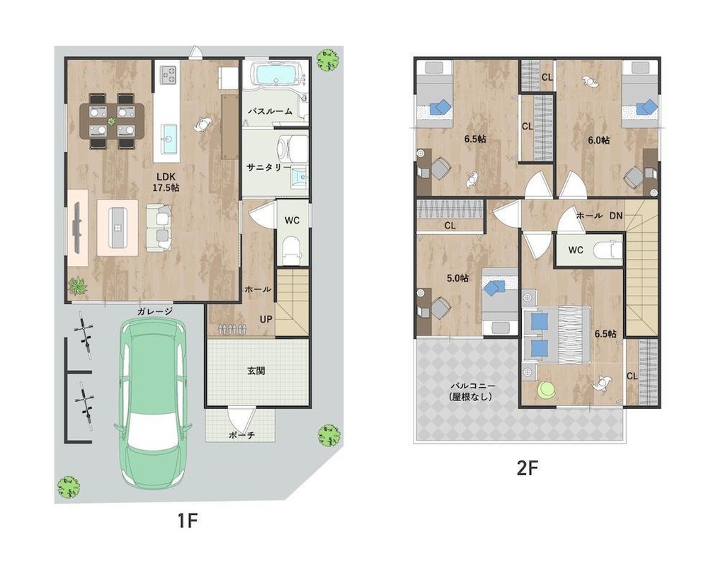 1階に水回りを配置した家事動線の良いプラン。LDKは約17.5帖の広さで、ご家族でゆったりとお過ごしいただけます。2階には洋室を4部屋設け、プライベート時間も充実します。《建物面積98.82m2、建物価格1775万円》