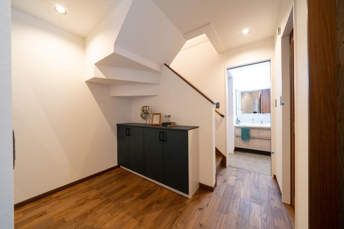 2ヶ所のFIX窓を設けた、明るく開放感のある玄関スペース。土間は広々としており、アウトドアリビングとしても使用できます。階段下のスペースを活用して玄関収納を設けました。