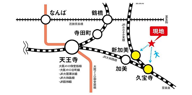 おおさか東線「新加美」駅 徒歩12分 JR関西本線「久宝寺」駅 徒歩18分 JR大阪環状線「天王寺」駅 バス28分「加美小学校前」停 徒歩17分 |