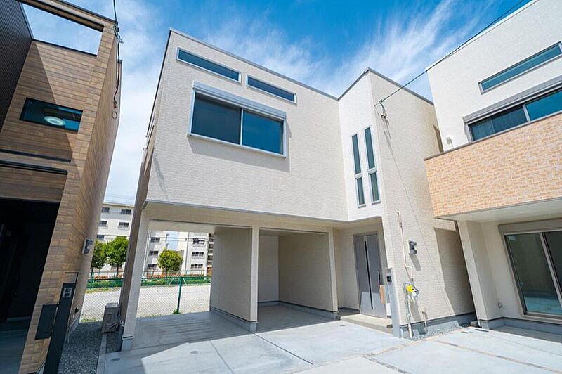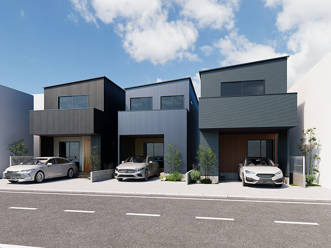 ダークカラーで統一されたスタイリッシュな外観。全棟インナーガレージ付き2階建です。多彩な建物プランをご用意しております。自由設計でご家族の理想の住まいが叶います。