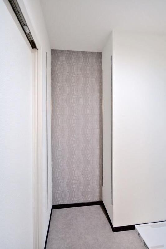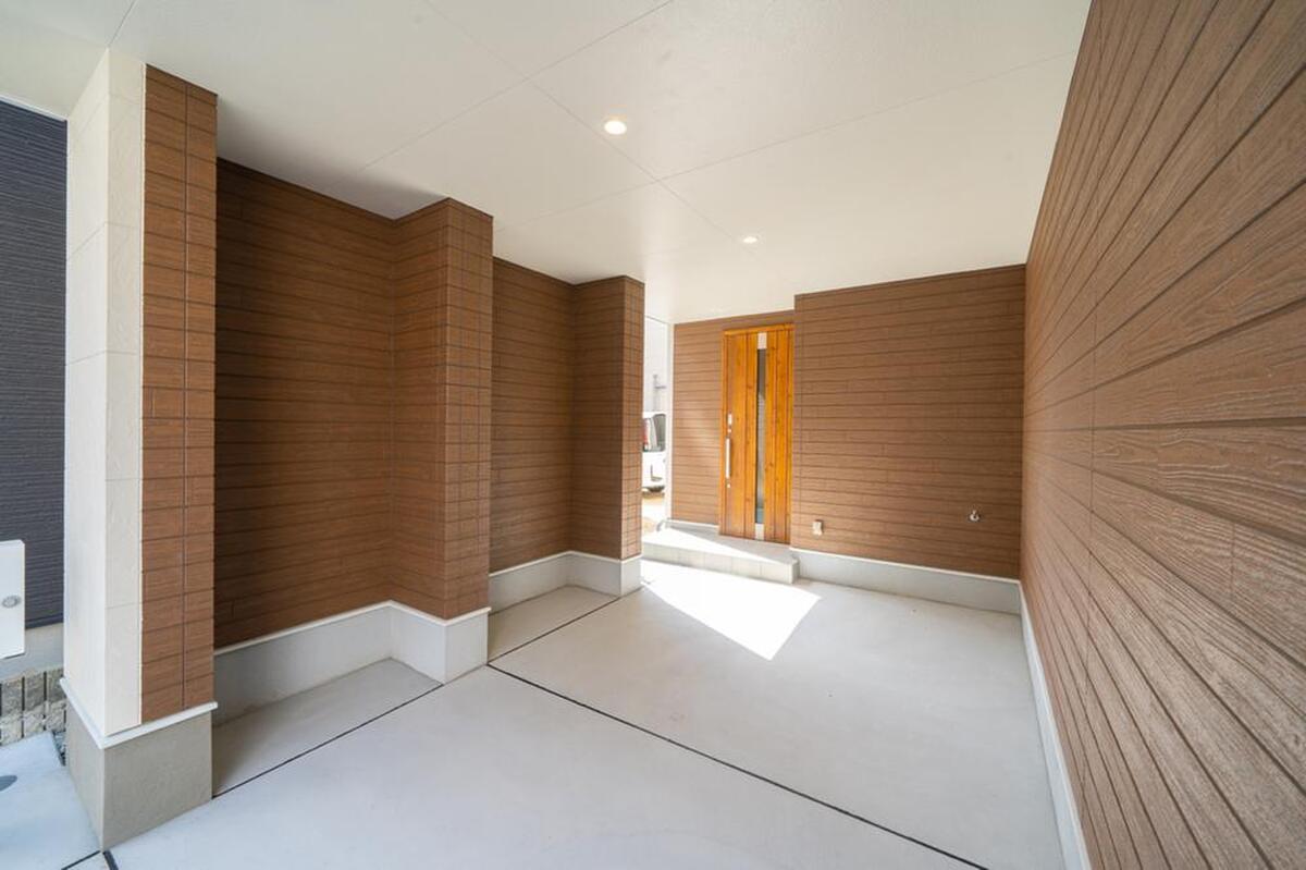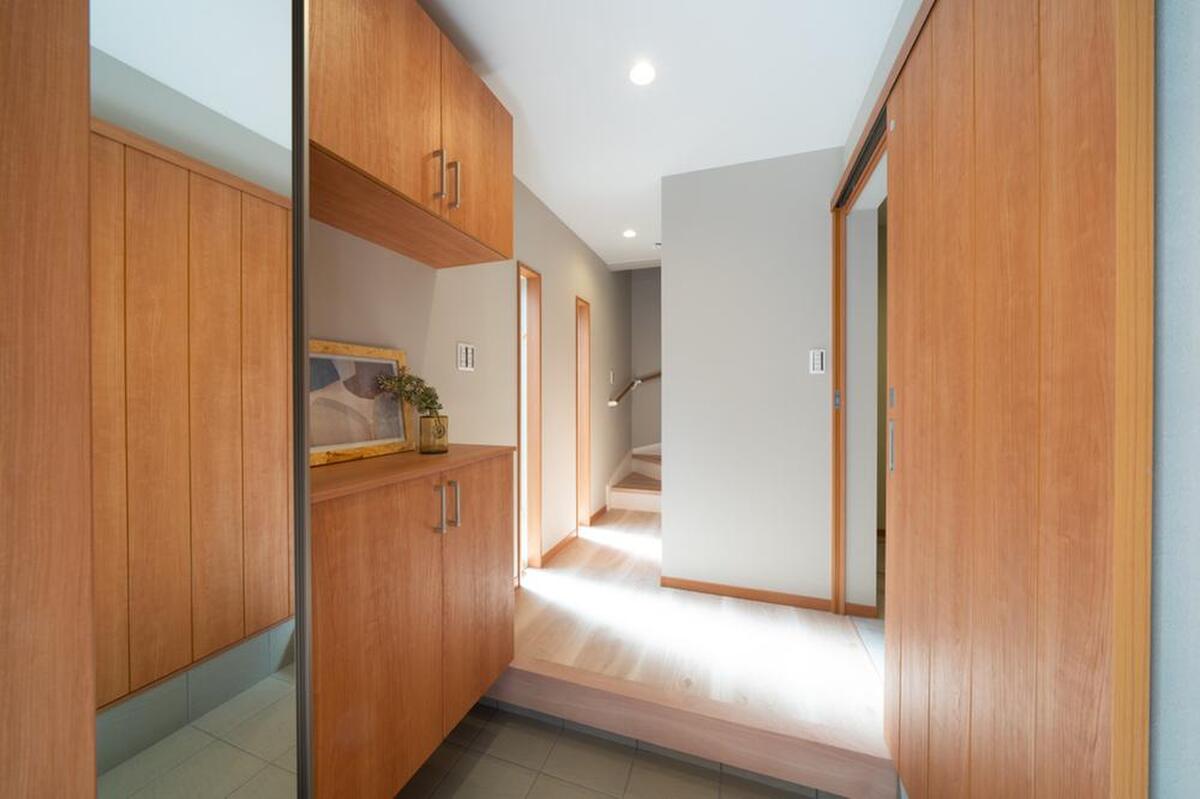 光差し込む広々玄関は、木目調の建具とグレー調のクロスがお洒落な...