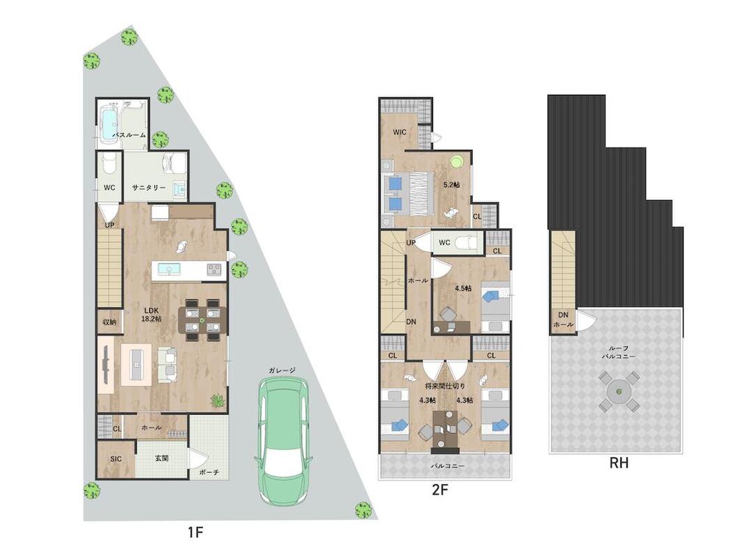 階段を使わずすぐくつろげる、1階LDKプラン。2階には将来間仕切りが可能な洋室2部屋を配置。屋上にはルーフバルコニーを設けた住まいです。《建物面積98.21m2、建物価格1764万円》