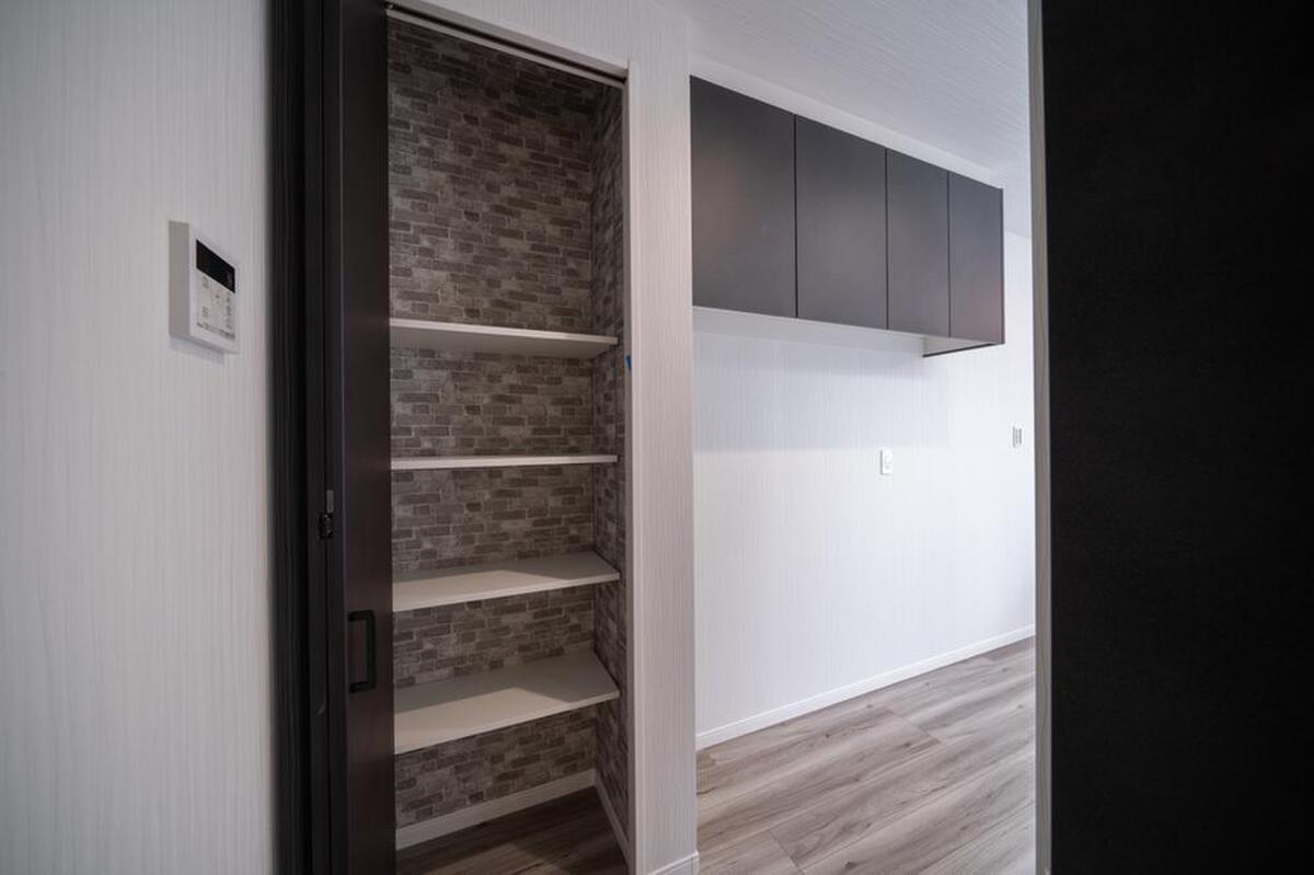 洗面室と浴室の間に脱衣室を計画。可動式の棚がついた収納スペースをつくり、タオルや洗剤のストック品を収納できます。